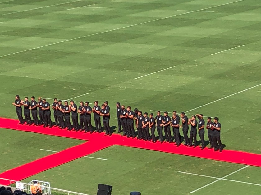 選手入場。熱い熱い。19:15キックオフ。